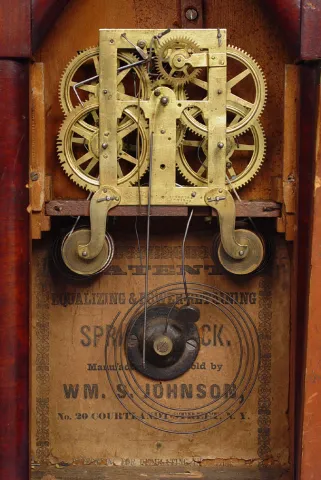 Circa 1850 5 inches painted dial, 30-hour, brass fusee movement, has label of WS Johnson, No. 20 Courtlandt St, NY, very good overall old finish, mirror tablet replaced, movement complete and in fine working order. Height 19 1/2 inches