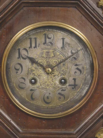 Circa 1890 5 inches silver engraved dial, 8-day, solid plate brass movement, fancy case and dial similar to Lenzkirch quality, wood case with normal w...