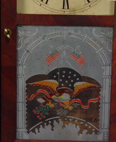 Circa 1850 5 inches original dial with crazing, 30-hour, fusee movement, mahogany veneer case, reverse painted door features stenciled American eagle motif, small veneer chips from case, movement needs spring repaired. Height 20 inches