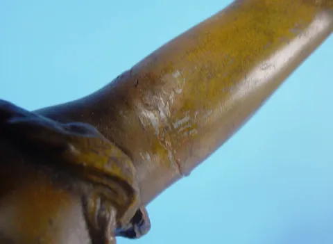 French "CIE" Trademark Large French Swing Arm Clock, Circa 1915 6 inches ball type dial, with applied bronze numerals, 8-day, brass spring driven movement, statue base has plaque stating "Brise D'Automne par Aug Moreau (Med. D'Or)", base of statue is also signed Aug. Moreau, a wonderful large swing arm clock that has been professionally restored to its original splendor, sometimes referred to as "Flower Girl", excellent restored condition, with repair to woman's left arm,. Height 40 inches
