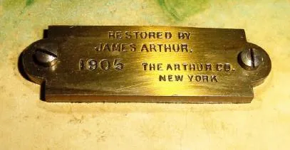 Mr. Arthur has applied a brass plaque to the re-painted dial bearing his name and the year 1905, and in addition has hand written instructions for care of the clock that are covered by the hood (the instructions are penned and signed by Mr. Arthur himself). However, Mr. A was the most unorthodox of clock restorers and paid no attention to originality. There is a 1" reinforcement board added to the entire back of the clock, and the front door of the trunk and of the hood were re-made by him. There is NO glass in either door, and the hood door is coming loose. The "Compensating" pendulum is a nightmare creation of Mr. A himself, and the dial has certainly been painted with his own artistic touches. He tried to put a "jewel" finish on the movement front plate & levers, and it is crude for sure. Still these Arthur clocks are prized by some and we are interested to see the level of interest. One counter weight is missing, one large weight with no bail or hook. Height 94 inches