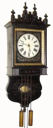 This case is an earlier version of the more common picture frame clock you find with the pendulum exposed; there is a good bit of wood worm damage, b...