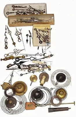 Mixed box lot of around 2 dozen clock hands (mostly old), couple of pulleys, and 8 assorted gongs.