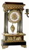 C.1890, French, Bronze Empire Mantel Clock Set, nicely restored. Condition: this is a great looking set that has been disassembled and cleaned and reassembled. The porcelain dial is excellent, original moon hands perfect and movement is clean and going.. Each candle stand holds 4 candles, bases a close but not perfect match to clock/ coloration is identical. Height of candelabra 15Ò; height of clock 16 inches