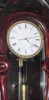 Condition: This clock suffered some case damage enroute to New Hampshire; the case stabilizers got sheared off the case (and are now absent, and return molding damaged),and one tiny finial on the left side of the door got lost, and various scrapes to the finish on the door. Two dowels for the finials are broken (setting in foto). Will need suspension spring. Otherwise, this is a very uncommon clock, with two winding barrels that work like this: while the main barrel is unwinding, an extra gear on the front of the barrel is turning a sister barrel, thus winding up a dangling cord on the right side of the case. When the week is up, you simply pull the external cord and the process is reversed. Some modest case restoration will improve this clock. Height 55 inches