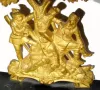 C.1810, Austrian Zappler, on a C.1910 wooden base with cast/ gilt dog. Condition: The ormolu casting of 3 hunters with muzzle loaders, and their 3 retrievers, chatting under a tree, is GREAT with original gilding intact. The tiny Zappler movement is sound and ticking, now with an alarm clock winder that sound be removed. Movement is dry and not in beat and stops after a minute. Porcelain dial is perfect and moon hands are original. Height 7.5 inches