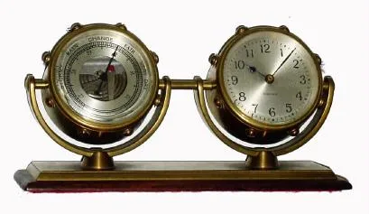 C.1950, Chelsea Desk Set, barometer and 8-day timepiece, as-found. Condition: the clock does run and the barometer is "live", however all 16 "spokes" are missing from the case, holes now filled with brass machine screws. You will need to make the 16 spokes or use the movements in another case. Movement is original to case and is running OK. The glass to the barometer has been replaced, as there is no reference hand to indicate movement of the barometer's main pointer This clock is proof that if you spend $20 on a poor clock, you will barely make bank interest, but if you spend $100 on a good clock, same model, it will double in value. Height 4.5 inches