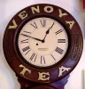 Unusual case, it is grain painted rather than the maroon color of other Bairds. This finish is original and it is known to have been done on this clock case in particular. The lettering is cream, another diversion from the usual Bairds. The bottom door has advertising for the product. The advertisement is in relief 9 1/4" x 5". Background colors of blue, black and lettering in blue, black and cream. The label inside of the clock is in excellent condition. The works are signed. The dial pan is original to the clock, however someone has restored the dial and then pasted "Baird Clock Co Plattsburgh NY" back onto the dial. There is a slight chip on the bottom bezel on the outside rim, between 11 and 12 o'clock position. This clock is 100% original with the exception of the dial.