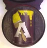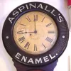 One of the more unusual Baird's. The bottom door has a simulated paint can and brush on it. It is a likeness of a half pint can. The size of which is 8" high, half diameter of 5" and protrudes 2 1/2". The colors on the paint can are yellow on the brush and dripping down the can, letter "A" in silver and the paint can is brown. The dial is 11" with some staining at the edges, strong numerals and Baird Clock Co., Plattsburgh, NY USA. Label is 40 % intact. Hands and pendulum are original. The original finish on the clock is maroon. Some of the letters have been strengthened in silver. The top bezel is 18 1/2" in diameter with some roughness at the 9 and 3 o'clock positions. There is a small chip out of the bezel on the back at the top by the number 3. This clock has an early Plattsburgh Baird movement. The works are original to the case, signed Seth Thomas Clock Co. for E. P. Baird and Co. NY and Montreal.
