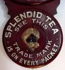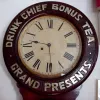 Baird clock, Chief Bonus Tea model, circa 1895. Works are original and signed Baird Clock Co. Plattsburgh NY. The case is maroon in color with silver lettering. In relief on the bottom door is an Indian figure head with black face, sporting a light turban, beard and mustache. The paper dial is perfect, the label mint, as well as the finish, hands and pendulum being original. The height is 30 1/2", top bezel is 18 1/2", bottom door is 12", depth is 4 1/4" and actual dial is 11". On a scale of 1 to 10 this is a 9.5 to 9.8.