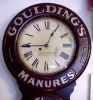 Baird Clock, Goulding's Manures, circa 1895 Made by Baird Clock Co. Plattsburgh NY USA as signed on the dial. The works are also signed. Hands and pendulum are correct. Clock is 18 1/2" top bezel diameter and 30 1/2" high. The dial show some age and discoloring, the signature is strong. The label 100% intact with a second label pasted directly below the original Baird Clock Co. label. The second label states "this clock is the property of W and Height Goulding Limited and is to be returned to them on holder ceasing to hold their agency". Finish on the clock case is old original maroon with silver lettering, NOT A REPAINT. Bottom door is 12" diameter with glass aperture.