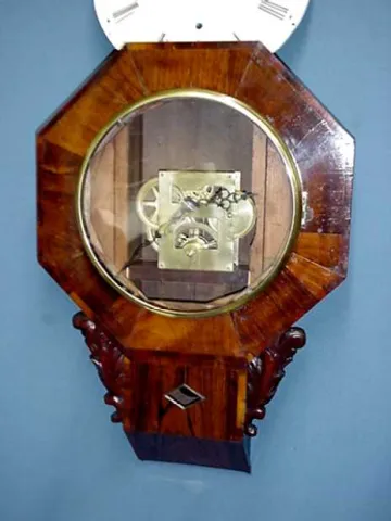 Clock, rare Chauncey Jerome, 8 day American fusee wall clock.CIRCA: 1823-1844 SIZE: 22" x 15" x 4 1/2" with a 10" dial MAKER: Chauncey Jerome, Bristol CT DESCRIPTION: The clock movement is a fusee, week duration, without strike. The actual fusee is tapered like its English counterparts. 90% of American clocks were of one day duration. The clock was professionally rebuilt and keeps accurate time. The back plate is signed " Chauncey Jerome, New Haven Connecticut USA". See additional photos. This clock was made prior to 1840, after 1840 they were marked either Jerome and Co. or Jerome Manufacturing Co. Chauncey Jerome apprenticed and worked for the famous clockmaker Eli Terry from 1816 to 1822. The case is rosewood veneer with its original finish. There is no damage or missing veneer. There is a small shrinkage crack above and below the pendulum aperture. The carved walnut side pieces are original. There is a hinged door on the bottom right side for pendulum access. The entire back is hinged for access to the mechanism, which slides out. The hinge screws apparently pulled out at one time and the door was reversed. The original bezel is heavy cast brass, the original hands are also heavy cast metal. The old enamelled zinc dial was restored some time ago. The old dial has a plugged hole, 2" below the center hole. This is a relatively small clock, only 22" long and extremely rare.
