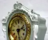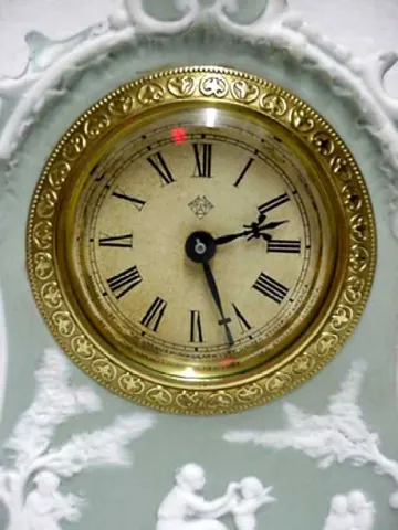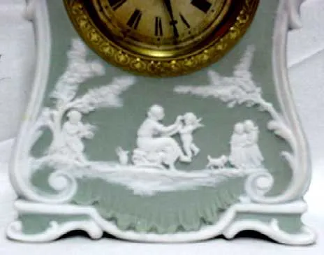 Jasperware clock, Ansonia miniature boudoir. 6" by 4 1/2" by 2 1/4" This is a rarer colored case, green and not the common blue. It is Jasperware, no...