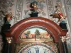 In his book entitled 'DUTCH ANTIQUE DOMESTIC CLOCKS'Published in 1973 and now long out-of-print, Dr. J.L. Sellink comments that, "The Notary clock is considerably more rare than a normal (size) Friesland Staartklok, so that it is not surprising that the price is about twice as high..". This book has long been regarded as the "Bible" on Dutch Clocks and when published over 30 years ago noted that the smaller, miniature tail clocks were even then rare and expensive. The term applied to these clocks by those in the trade is 'NOTARY CLOCK' because Dutch Notarys(Public)often displayed them in their offices. Dutch Notarys are highly trained professional persons of considerable esteem, whose services (and fees)are broader than those of American Notarys. Their choice of these smaller-size 'tail clocks' for their offices marks the clocks as being quite special. We have never before been able to obtain one for our customers. This nice example of a 'NOTARY CLOCK' came to us from a long-time friend who is also our Dutch clock supplier. It is in perfect operating condition, striking the full hours on a gentle bell and once on the half-hours on the same bell. The dial has the added colorful enhancement of what the Dutch called a bridal wreatHeight surrounding the Chapter Ring (the numeral ring). The term 'Bridal Wreath' was applied to clocks with an attractive wreath design in bas relief on the dial. They were sold to families and/or friends who intended to present them to brides as a wedding present. In the arch of the hood is a charming Dutch Village scene. There are also four figures in pressed brass on each spandral (corner) of the dial. The clean, heavy brass mechanism retains its original alarm unit which has (as is almost always the case) been disconnected. The drive chains for the alarm device are retained, with their two weights (one small and the other, a counter weight, somewhat larger (see photographs). The reason that these alarm mechanisms are usually disconnected is that once they begin to alarm (striking on the hour bell), they don't stop until completely wound down!! On the top of the hood are the three typical Dutch Clock figures...two Herald Angels blowing trumpets--one on either side, standing on 'chimneys' or pediments. In the center, at the top of the arch is another figure depicting Atlas holding the world on his shoulders. The lower end of the 'tail' has an ornate glass enclosed window with a brass cartouche through which the long brass pendulum 'bob' can be seen as it swings back and forth(see photograph). The capitals at the top of each side column on the bonnet have been re-gilded as well as the base collars of the same columns. PLEASE DON'T CONFUSE THIS 'PRIZE' WITH THE TYPICAL, LARGER DUTCH TAILCLOCKS. Full-size tail clocks are, in their own right, scarce and very desireable...but, this smaller 'NOTARY' is a type that you might not ever find again. We been looking for one for many years and are pleased at this time to offer it to discriminating buyers. Height: 45 in. (114.30 cm) Depth: 8 in. (20.32 cm) Width: 11 in. (27.94 cm) Weight: 25