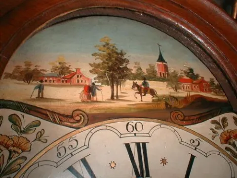 30 hour Dutch wall clock with figures on hood.