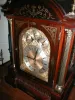 We can only imagine the magnificent Baronial mansion in which this huge English bracket clock must have first been displayed. It would have had to be a castle or one of those British estates with a mantle capable of supporting the 75 pound weight of this amazing clock. The mechanism includes a nested eight-bell chime system on which the Whittington melody sounds every fifteen minutes. There are also four heavy steel coiled gongs on which the Westminster chime melody plays on the quarter hours. The owner may select either of these strikes by turning the indicator on the dial to point to the preferred melody. Look at those wonderful Gold embellishments on the dial They have been hand-cleaned and will never tarnish. The beautiful Mahogany case has only a few veneer age-lines-and the veneer is all solid and complete (not at all distracting)and features brass inlay with open work brass side-windows backed by the original red cloth curtains (see photograph),which allow the chimes to fill the room every fifteen minutes--unless the owner silences the strike altogether by turning the indicator on the dial from CHIME to SILENT. There is also a subsidiary dial to fine-tune the speed of the clock's operation-FAST(er) or SLOW)er). (see photograph). The large bun feet also have brass inlay. The movement is engraved on the back plate and runs and strikes perfectly. Height: 31 in. (78.74 cm) Depth: 11 in. (27.94 cm) Width: 18 in. (45.72 cm) Weight: 75