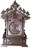 Junghans shelf cuckoo, ca. 1890. 22 inches high fancy carved case, seems to be constructed of walnut and possibly linden wood stained walnut. Finish is original. 6 inches wood dial, good large numbers, old bone hands. Top crest with hand carved leaves is replaced. Lots of carvings around large door, extra large old cuckoo bird. Extra nice feature of this clock is the signed 8-day heavy duty Junghans movement. As the bellows cuckoo, the movement strikes a large cathedral gong also marked Junghans. Bellows and tops are complete but movement needs to be serviced, was in storage a long time.
