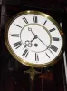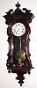 C.1860, Austrian, Dwarf Serpentine, 1-weight timepiece. Condition: the dark mahogany color case retains original finish that has been rubbed to a high sheen; there is an age crack at the bottom of the door and a repaired crack at the top. Right return molding on the top has been replaced. Original porcelain dial has some hairline cracks and a chip repair. Movement is mounted on a wooden seatboard that slides into original corbels. Height 42 inches