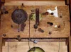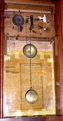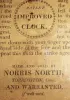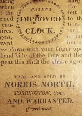 C.1825, Norris North, Torrington, Conn, miniature pillar and scroll, with restorations. Condition: this clock has been carefully restored by a very good workman, but even his talents can not cover the signs of repair. The dial, hands, columns, scrolls, feet and skirt are new. Mounts for the dial are new. The balance appears old, including a nice label, now protected under plastic. The movement is complete and sound, with some repairs, ticks and strikes. The door tablet is old, C.1845 from a New York OG (Sperry or Johnson origin). As you can see from the foto, this clock is cosmetically very attractive. An original of this model would bring around $5000. The set of period finials is worth $500 alone. We have estimated this at the price of a nice reproduction. Height 28.7 inches