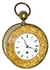 C.1840, French, Novelty Timepiece, in the form of a large pocket watch. Condition: although most of the gilding is worn from the exterior of the case, the dial surround is still brilliant. The well made silk thread movement is clean and running and with unique pendulum, shaped like an anchor, that just fits inside the case. Diameter of case 6.3", total Height 9.5 inches