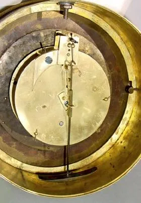 Condition: although most of the gilding is worn from the exterior of the case, the dial surround is still brilliant. The well made silk thread movement is clean and running and with unique pendulum, shaped like an anchor, that just fits inside the case. Diameter of case 6.3", total Height 9.5 inches