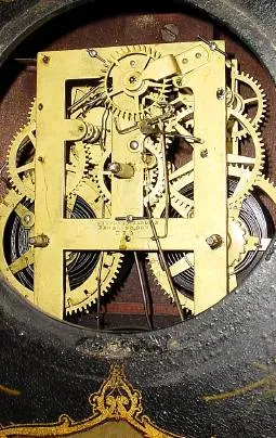 C.1850, Litchfield Mfg Co, Papier-mache case with original decorations and mother of pearl, and with a "molded in" shelf at the bottom, similarly decorated, with original 8-day time and strike movement (signed Chauncey Jerome)