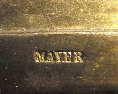 Condition: the finish on the dog is worm mostly to bare metal. The embossed metal tail has been repaired. The well made brass movement is signed "MAYER". The compound pendulum enclosed within has an extension for the red painted tongue, and on the other end a pivot is attached to the tail, resulting in eye catching movement. The 1" porcelain dial has some cracks. Overall good condition for its age. Height 5 inches