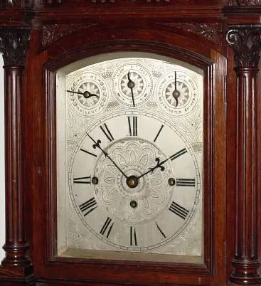 Condition: other than a vertical split in the mask that goes 'round the dial, this clock is in very good original condition. There are 3 subsidiary dials in the crest above the chapter ring for F/S, Chime /Silent, and Chime on 8 Bells (Whittington), or Westminster (on 4 bells). The robust and well made movement will need some oiling and adjusting, but is complete and sound. The substantial case retains original finish in very good condition with nice sheen. Height 23 inches