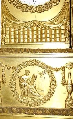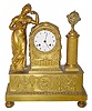 C.1810, French, Ormolu Figural Clock, ALLEGORY OF ASTRONOMY, With 8-day silk suspension, bell strike movement. Condition: has been setting on a shelf for 20 years and has dust and grime; around 60% of the gilding is intact, and if you immerse the case in clock cleaner (don't rub) it will brighten up nicely. See this clock in FRENCH BRONZE CLOCKS, (Schiffer, 1999), page 92, where E. Niehuser writes: "The pendulum bronze has a strict symmetric composition after a design by Jean-Andre Reiche, whose original design, dated 1809, has survived (Bibliotheqye Naionale, Cabinet d'Estampes Le 30, 18). The base relief again refers to the subject of studying: a genius and an oil lamp ar eshown within a laurel wreath" This is one of several clocks in this sale that are explained by Niehuser. Dial signed Fort a' Paris .Ht 15"