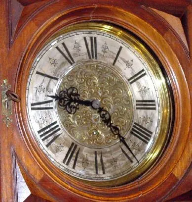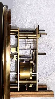 Condition: the single train movement is of the highest quality, with cut pinions, solid plate movement, click on the rear plate, on a slide mount and with engraved dial center and chapter ring. The case itself has dowels out the bottom where it mated with a larger piece of furniture; it is missing top right return molding. Lock in door is intact with key. Width 38 inches, 96cm, height 20.5 inches, 52cm.
