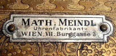 C.1905, Austrian, Mathias Meindl, Burgasse 3, Wien VII, 2-weight Vienna Regulator with signed movement, dial and beat scale. Condition: the top trim is from a chair back, doweled to fit the case; no extra holes in case top. There is a hole in the upper case back where the case was nailed to a wall (minor but present). Otherwise, the clock is original throughout and made by an Uhrmacher at a famous location, since there is to this day a clock shop at the same address, Burgasse 3, with the name Schmollgruber-Uhren. Height 45 inches