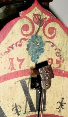 C.1795 (Dated) Austrian, Wood Works, Cows Tail wall clock, 2-weight, striking on a glass bell. Condition: the glass bell and bell standard appear to be proper replacements; pendulum also restored (fragile items in this configuration). The side covers are missing. Note only the pivots and pins are metal in this primitive clock, the balance is wood. Height 12 inches