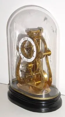 C.1880, French, Skeleton Clock and Dome, 8-day with 24 hour alarm disc and engraved front plate and base. Condition: movement is compete and sound, and ticking robustly. Has a brocot escapement, and heavy lenticular bob with F/S adjustment above 12. Old dome fits base fine. Height of frame 7 inches with dome and base 11 inches