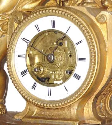 C.1890, French, Striking Conical Pendulum clock, figure of a cherub standing beside the clock, holding the pendulum in his hand.