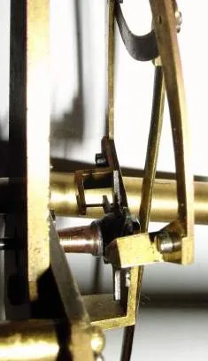 C.1810, French or Austrian, Movement only, pull wind via small rope, with unique dead beat escapement with escape wheel having 6 teeth only, and the escapement external to the clock, the round "pin" shaped pallets attached to the crutch and fully