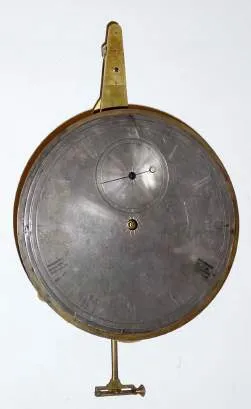 Condition: The 8" silvered dial is engine turned, although much of the pattern is worn away at this point. There is a sunken seconds bit turned right out of the brass dial, similarly engine turned within. Wheels have a high tooth count and we estimate the duration at 30 days or longer. There is a seconds hand, no others, no weight, no pendulum (would swing against the back of a case). The 4 mounting studs with original nuts are secured from the rear of the case with slotted spanner nuts, one stud bent. This is a unique and well made movement, with the special requirement of needing 5 inches of additional space above the dial for the apparatus that holds the crutch pivot. Ht from bottom of crutch to top = 14" [35.5cm]