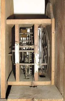 Condition: this case was apparently grain painted and decorated, now stripped to pine, some additional nicks and scrapes, and nail heads rusty from moisture. The movement, which was made to hang on the wall, is setting in the case on the original seat board. The paint on the dial has had some touch up at various numerals, and the paint on the apple, (which is supposed to appear as a cut apple), is worn some. The movement appears complete and sound. Big and decorative. Ht 55" [140cm]