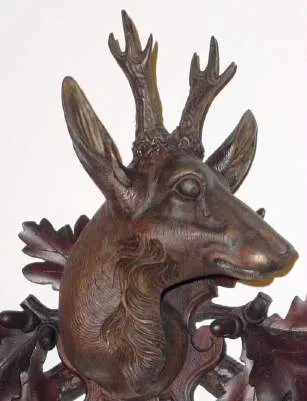 C.1915, German, Large Cuckoo clock, Hunting motif , with side carving of deer's head, rabbit pheasant and profuse oak leaves and acorns. Condition: The heavy cast plate movement has lyre in center of rear plate, and appears to have been cleaned, ticking robustly. One of the bellows is leaking and the "cuck" is quite weak, "coo" is OK. The carving is in good condition, and the leaves are deeply carved and with extra detail on most pieces; note the acorns. There is a vertical dry split in the front facade. The dial, hands and numerals are original. Ht 32" [81cm]