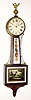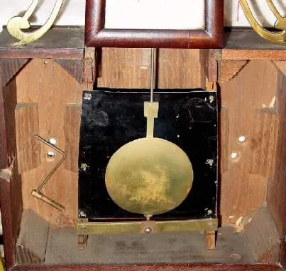 C.1830, Unsigned Boston area Banjo, weight driven, 8-day. Condition: not a bad old clock, has seen its share of restoration over the years. The bottom tablet of Mount Vernon was nicely restored around 1965. The relatively early movement has a steel crutch, and attaches to the back via tapered pins through 2 diagonally mounted screws in the back-board. Sawin was one of the most prolific producers in the Boston area, and it could well be by him. Does have a nice set of repro barbed hands, good early weight, and movement and hardware are all original to the case; orig dial attaches with 3 turn screws. Note also relatively slender bracket under the clock. Ht 41" [103cm]