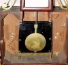 Condition: not a bad old clock, has seen its share of restoration over the years. The bottom tablet of Mount Vernon was nicely restored around 1965. The relatively early movement has a steel crutch, and attaches to the back via tapered pins through 2 diagonally mounted screws in the back-board. Sawin was one of the most prolific producers in the Boston area, and it could well be by him. Does have a nice set of repro barbed hands, good early weight, and movement and hardware are all original to the case; orig dial attaches with 3 turn screws. Note also relatively slender bracket under the clock. Ht 41" [103cm]