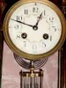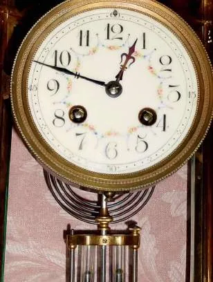Condition: Cast brass case in excellent condition, nicely polished. Original porcelain dial with fancy poly-chrome garlands is perfect and the hands are original. All the beveled glass panels are perfect. Movement is marked "Made in France". One of the decorative nuts to the original 2-vial pendulum is missing. Ht 10.5" [26.6 cm]