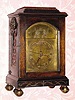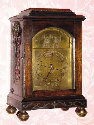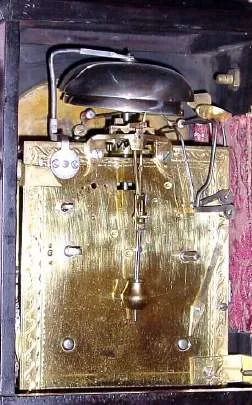 Late 18th century, English, Small Crown Verge, 2-fusee, Quarter Striking bracket clock, with a later C.1900 brass dial with block letters stating "RIMBAULT, LONDON", and with animation in the arch. Condition: the rear wind fusee movement has been cleaned and seems to be in good working order. It appears that a deft mechanic made a new brass dial (never silvered) to replace the old one, although it is unclear if the two men fencing in the arch are original or not. In any case they each swipe their sword at the other for each stroke of the quarter hour, and on the hour only the right swordsman raises his arm. Also has center seconds. The case with restorations, and lacking top finials. Our estimate would be much higher if the dial were original. Ht 11" [28cm]