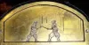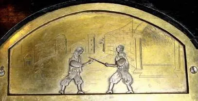Condition: the rear wind fusee movement has been cleaned and seems to be in good working order. It appears that a deft mechanic made a new brass dial (never silvered) to replace the old one, although it is unclear if the two men fencing in the arch are original or not. In any case they each swipe their sword at the other for each stroke of the quarter hour, and on the hour only the right swordsman raises his arm. Also has center seconds. The case with restorations, and lacking top finials. Our estimate would be much higher if the dial were original. Ht 11" [28cm]