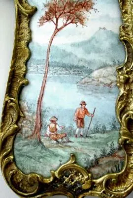 Condition: the dust cover for the watch movement has been nicely re-made. The watch has had its central bar repaired with soft solder, and it shows, but does not affect the operation; ticks OK. The 3 hand painted panels depict idyllic scenes in the Alps, and people in 19th century dress. Ht 6" [15.3cm]
