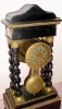 C.1880, French, 4-column Empire style ebonized clock with pressed brass trim and feet, and inlay of brass and MOP, 8-day time and bell strike. Condition: Case is in overall very good condition, quite clean. Original porcelain dial has a hairline crack and a small chip on the time-side winding arbor. Hands are original. R/A pendulum with a porcelain insert is perfect. Ht 21" [53.3 cm]