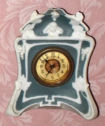 C.1910, Lot of 3 Novelty China Clocks: 1) Royal Bonn "Anvil" by Ansonia with two small chips on the top of the case (old and hard to see with dirt in the crevice), and with a stained dial. 2) Likely Waterbury "Dragon" with brilliant dial surround, and 3) German Jasper Ware mini (similar to Wedgewood), case with dirty, but overall very good condition and will clean up OK. From the M.A. Saiben collection. Avg Height 6.7 inches [17.5cm]