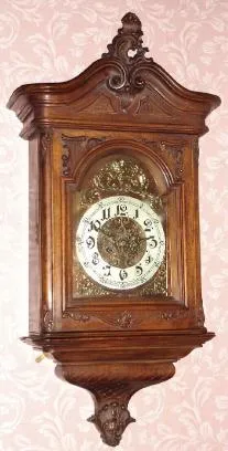 C.1880, Austrian, 2nd Baroque, 8-day time and strike hanging walnut cartel clock/ mixed lot. Condition: Beautiful walnut case in excellent condition with original finish, perhaps the best we have ever seen. Original composite dial signed "Karl Steinek, Fledsberg". Unfortunately the original movement was lost and someone has fitted a Gustav Becker spring movement to this dial and elongated the dial holes to fit it. Hands are not original. This would have been a very fine clock if not for the replaced movement. Height 33 inches [83.82 cm]