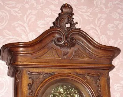 Condition: Beautiful walnut case in excellent condition with original finish, perhaps the best we have ever seen. Original composite dial signed "Karl Steinek, Fledsberg". Unfortunately the original movement was lost and someone has fitted a Gustav Becker spring movement to this dial and elongated the dial holes to fit it. Hands are not original. This would have been a very fine clock if not for the replaced movement. Height 33 inches [83.82 cm]