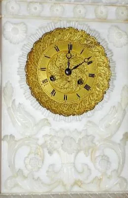 Condition: although several of the flowers have petals chipped, and the side flowers are missing, and the left arm to the top urn is broken [taped in place for foto], this is still well above average for what we usually find in this style clock case. The white alabaster is soft, making it easy to carve in fine detail, but that same softness makes it quite fragile. The well made bell strike movement is complete and sound and with pendulum. Total ht with urn = 20", ht without urn if you choose 14.5" [37cm]