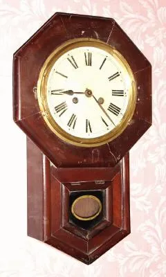 C.1910, German, 8-day time and strike European version of an American schoolhouse clock, as-found.